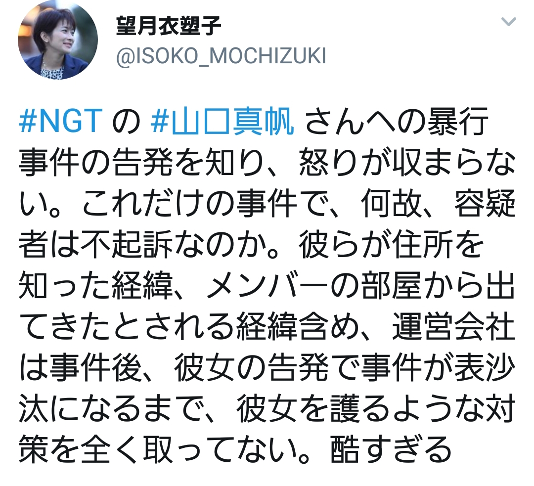 #NGT の #山口真帆 さんへの暴行事件の告発を知り、怒りが収まらない。これだけの事件で、何故、容疑者は不起訴なのか。彼らが住所を知った経緯、メンバーの部屋から出てきたとされる経緯含め、運営会社は事件後、彼女の告発で事件が表沙汰になるまで、彼女を護るような対策を全く取ってない。酷すぎる