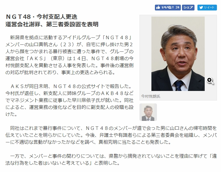 【NGT48】怒りの新潟日報砲炸裂!「今村支配人更迭」と断言!