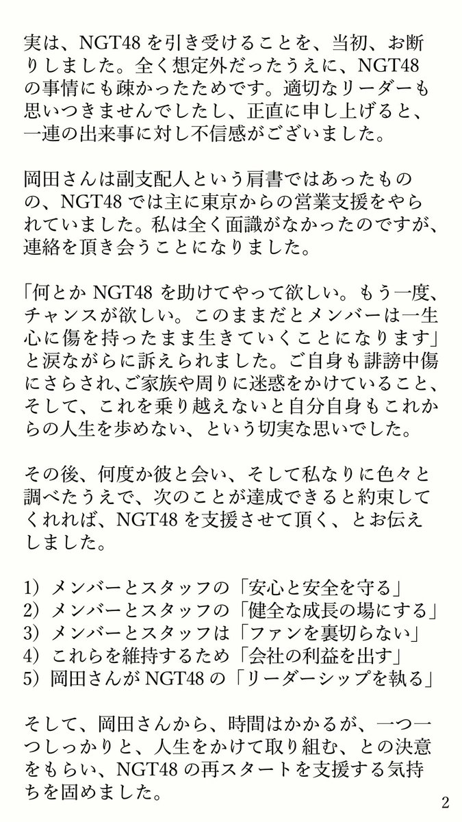 さらに、一連の騒動で不信感を覚えていたため、当初はNGT48の運営を引き受けることを断っていたことも告白。