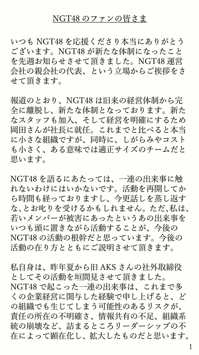 続けて、昨夏から、当時のAKB48グループ運営会社・AKSの社外取締役として活動してきたことを明かし、NGT48の騒動を「どの組織でも生じてしまう可能性のあるリスクが、責任の所在の不明確さ、情報共有の不足、組織系統の崩壊など、詰まるところリーダーシップの不在により顕在化し、拡大した者と思います」と分析した。