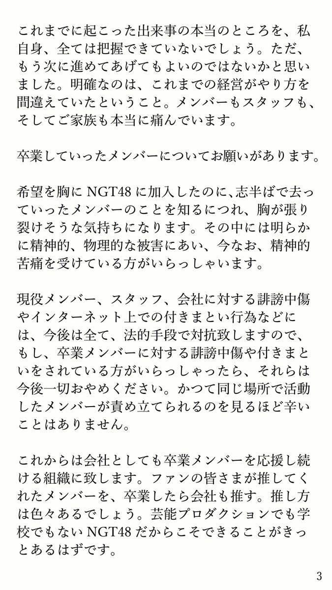 「現役メンバー、スタッフ、会社に対する誹謗中傷やインターネット上での付きまとい行為などには、今後は全て、法的手段で対抗します」とし、卒業メンバーに対する誹謗中傷や付きまといをされている方がいらっしゃったら、それらは今後一切おやめください。かつて同じ場所で活動したメンバーが責め立てられるのを見るほど辛いことはありません」と訴えた。