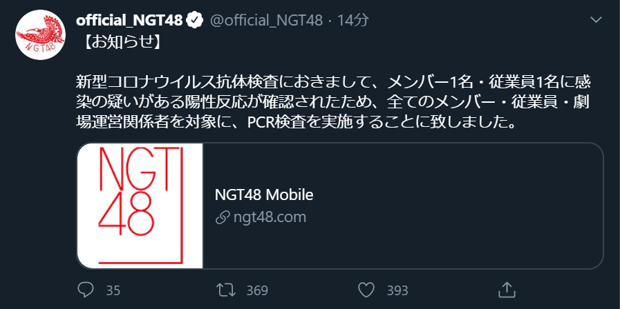 2020年7月27日(月)、劇場公演再開に向け実施した、新型コロナウイルス抗体検査におきまして、NGT48メンバー1名(清司 麗菜)と従業員1名に、感染の疑いがある陽性反応が確認されました。