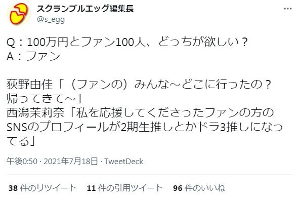 【悲報】西潟茉莉奈「私を推してた人がどんどん2期生やドラフト3期生に推し変してる」
