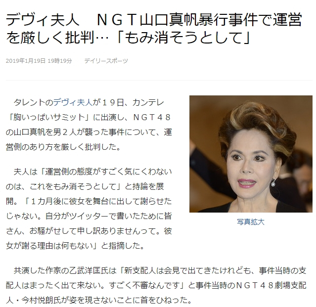 【NGT48暴行事件】デヴィ「帰宅時間教えたとか運営が作り上げたストーリー。(文春)これはウソウソウソ」【山口真帆】