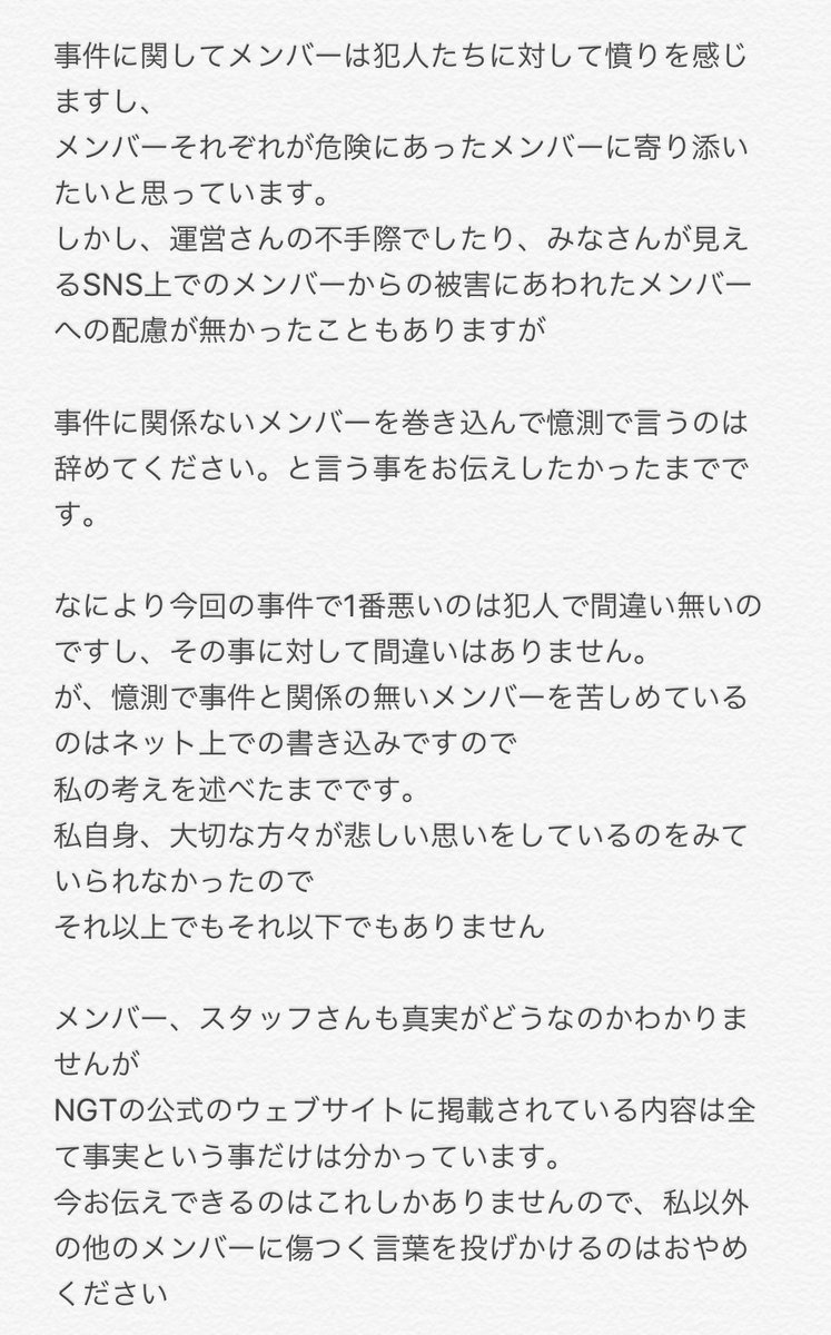 被害にあったメンバーも不安だと思うので一NGTメンバーとして、メンバーの居場所を開けながらその分もNGTメンバー全員で頑張ろうと思っています。
