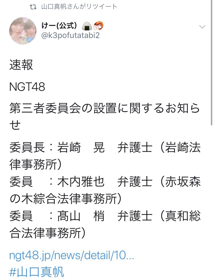 【NGT48】山口真帆さん、第三者委員会への疑念をリツイート