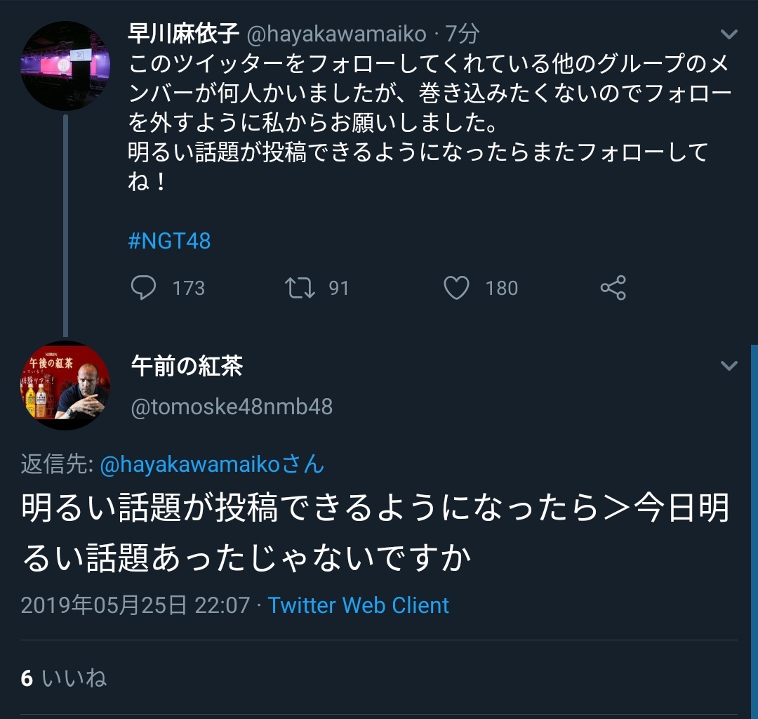 【NGT48】早川麻依子支配人「明るい話題が投稿できるようになったらまたフォローしてね!」→炎上www