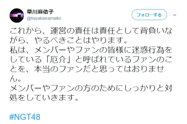 【NGT48】早川麻衣子支配人「メンバーやファンのために厄介の対処をしていきます」