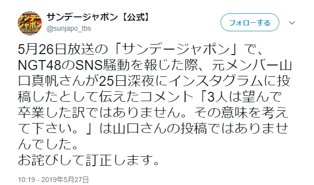 同番組は公式ツイッターで「5月26日放送の『サンデージャポン』で、NGT48のSNS騒動を報じた際、