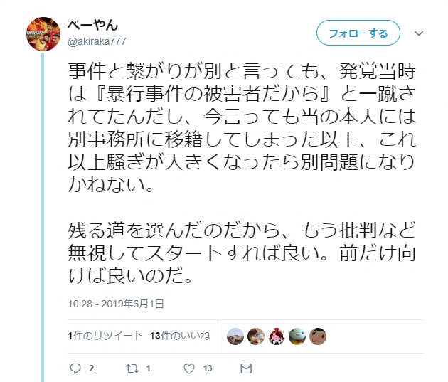 事件と繋がりが別と言っても、発覚当時は『暴行事件の被害者だから』と一蹴されてたんだし、今言っても当の本人には別事務所に移籍してしまった以上、これ以上騒ぎが大きくなったら別問題になりかねない。