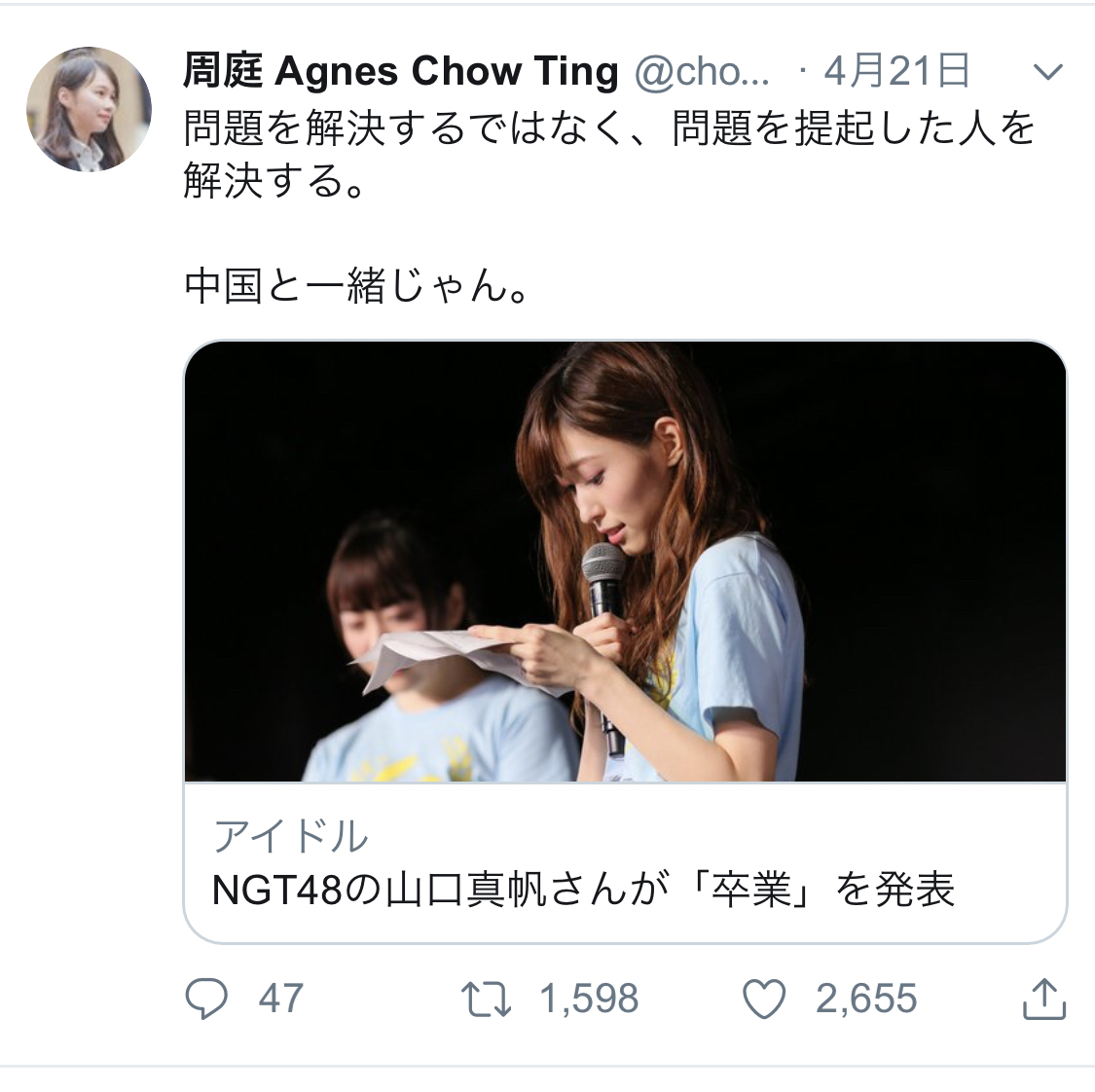 【AKS】香港民主化の姫がNGT運営を痛烈批判「問題を解決するではなく問題を提起した人を解決する。中国と一緒じゃん」