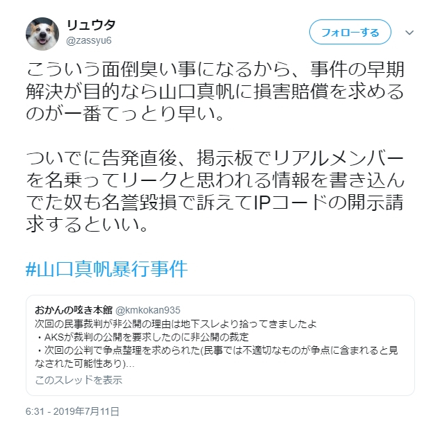こういう面倒臭い事になるから、事件の早期解決が目的なら山口真帆に損害賠償を求めるのが一番てっとり早い。