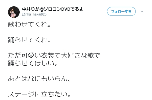 【NGT48】中井りか「歌わせてくれ。踊らせてくれ。ただ可愛い衣装で大好きな歌で踊らせてほしい。あとはなにもいらん、ステージに立ちたい」