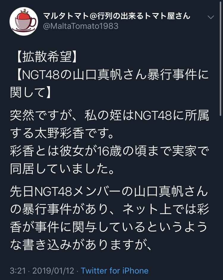 【NGT48】太野彩香の自称親戚「そのような事実は一切ない。風向きは変わる」